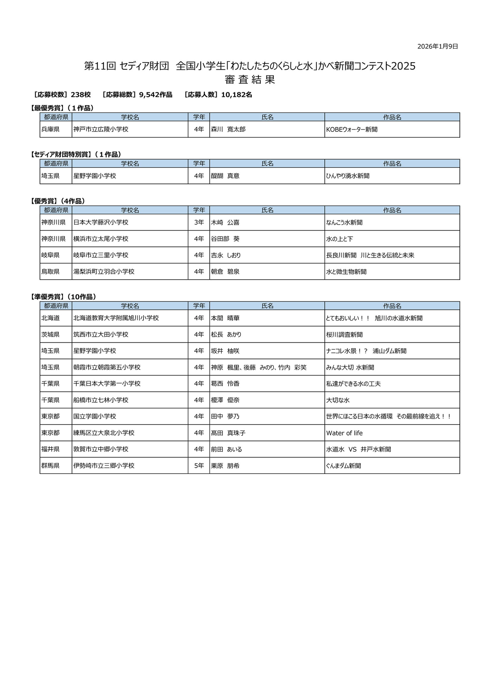 第11回 全国小学生「わたしたちのくらしと水」かべ新聞コンテストの審査結果~入賞者~を掲載しました。